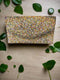 This beautifully crafted clutch bag features an intricate pattern of glass beads woven into the fabric, showcasing a timeless technique. This decorative art form was traditionally used in the creation of reticules, a type of drawstring purse.